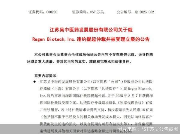 *ST苏吴一份公告将艾塑菲的独家代理权之争推向新焦点。8月11日晚,*ST苏吴发布公告称,达透医疗就关系纠纷向深圳外洋仲裁院拿起的仲裁于8月7日被崇敬受理,苦求阐发《独家代理权公约》有用并条件对方链接履行供货义务,更在仲裁苦求未获支执的预案中提议高达16亿元的亏本索赔,波及阛阓建树资本、结尾供货失约及合同时可得利益等多项亏本。